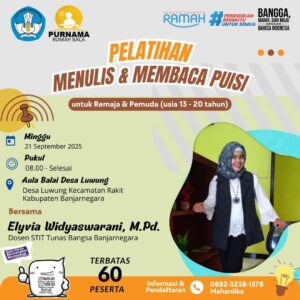 Banjarnegara — Upaya mengembangkan kreativitas literasi generasi muda terus digalakkan. Kali ini, Rumah Baca Purnama Banjarnegara menggelar kegiatan bertajuk Pelatihan Menulis & Membaca Puisi bagi remaja dan pemuda usia 13–20 tahun. Acara berlangsung pada Minggu, 21 September 2025, mulai pukul 08.00 WIB hingga selesai, bertempat di Aula Balai Desa Luwung, Kecamatan Rakit, Kabupaten Banjarnegara.